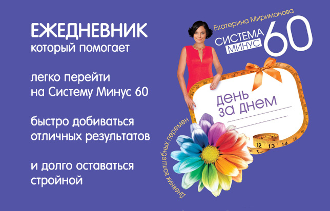 Пошаговые советы помогут перейти на Систему без усилий и следовать ей без ошибок, а значит – добиваться нужных результатов легко и быстро, а главное – сохранять их надолго. Кроме того, каждый день вас будут сопровождать рекомендации и задания: кулинарные и косметические рецепты, физические упражнения, психологические задания. И конечно, вы будете отмечать на страницах этого ежедневника свои успехи на пути похудения. А удобный список продуктов и основных правил системы поможет с этого пути не сбиться.